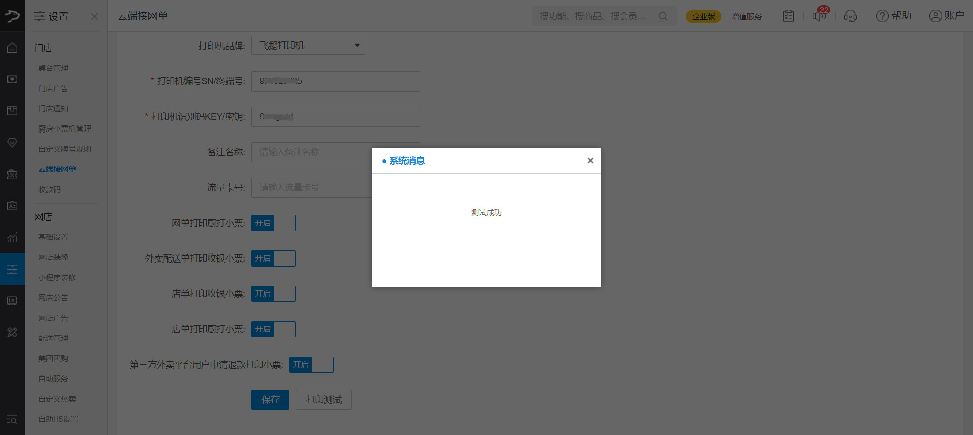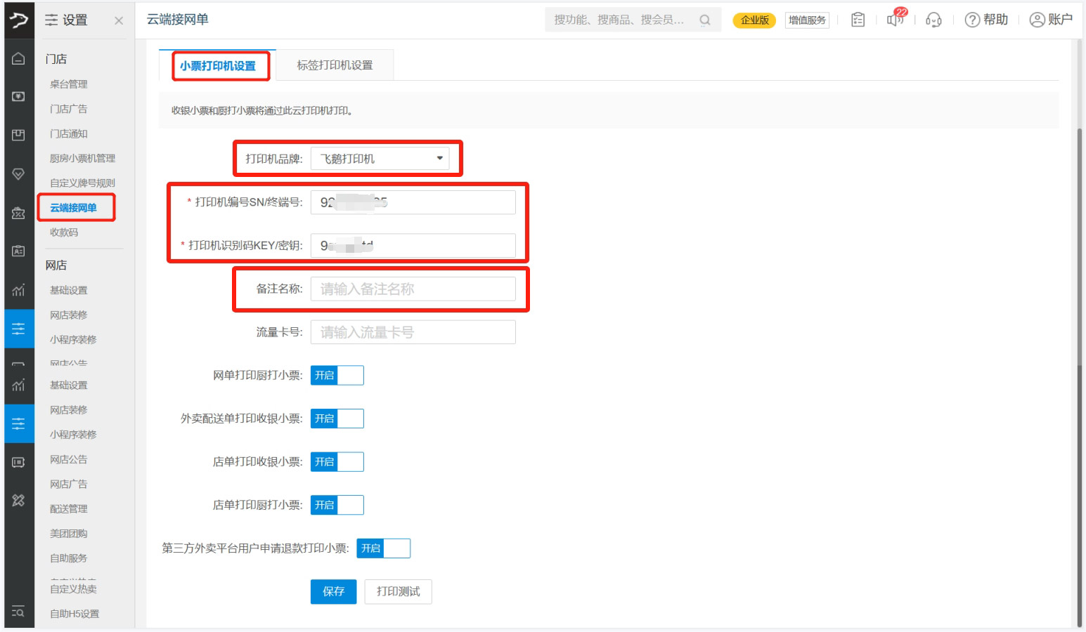 在银豹后台,设置-门店-云端接网单->【小票打印机设置】; 根据页面提示,品牌选择“飞鹅打印机”,根据打印机底部标签填入编号、密钥,填写打印机备注名称方便管理;可根据需要完成其他小票打印设置;