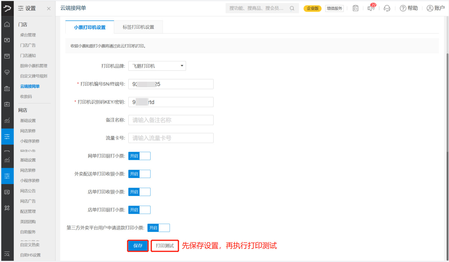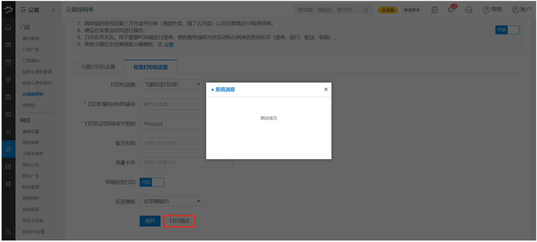 设置好后保存信息,执行打印测试,测试是否成功连接小票打印机;