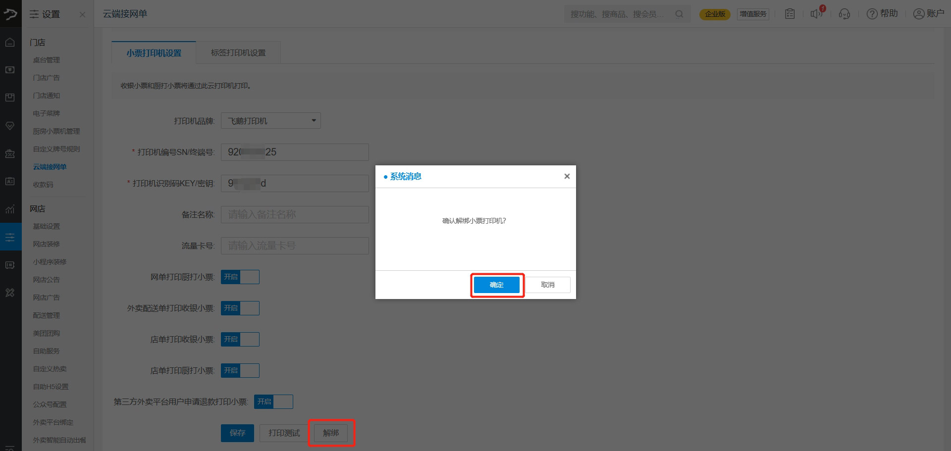若绑定小票打印机后,需要解绑,可点击【解绑】,确认解绑小票打印机。