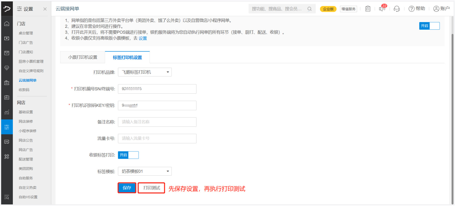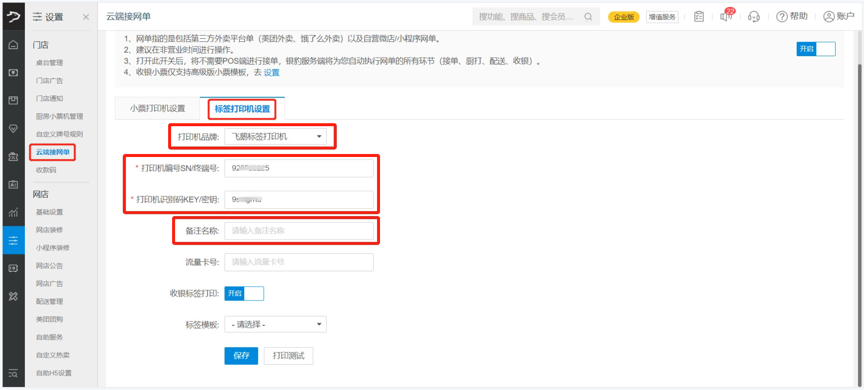 1.在银豹后台,设置-门店-云端接网单->【标签打印机设置】; 根据页面提示,品牌选择“飞鹅打印机”,根据打印机底部标签填入编号、密钥,填写打印机备注名称方便管理;可根据需要设置是否开启收银标签打印;