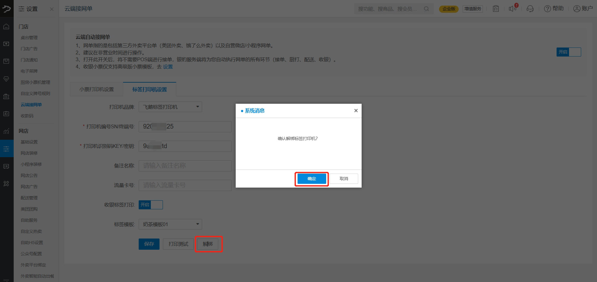 若绑定标签打印机后,需要解绑,可点击【解绑】,确认解绑标签打印机。