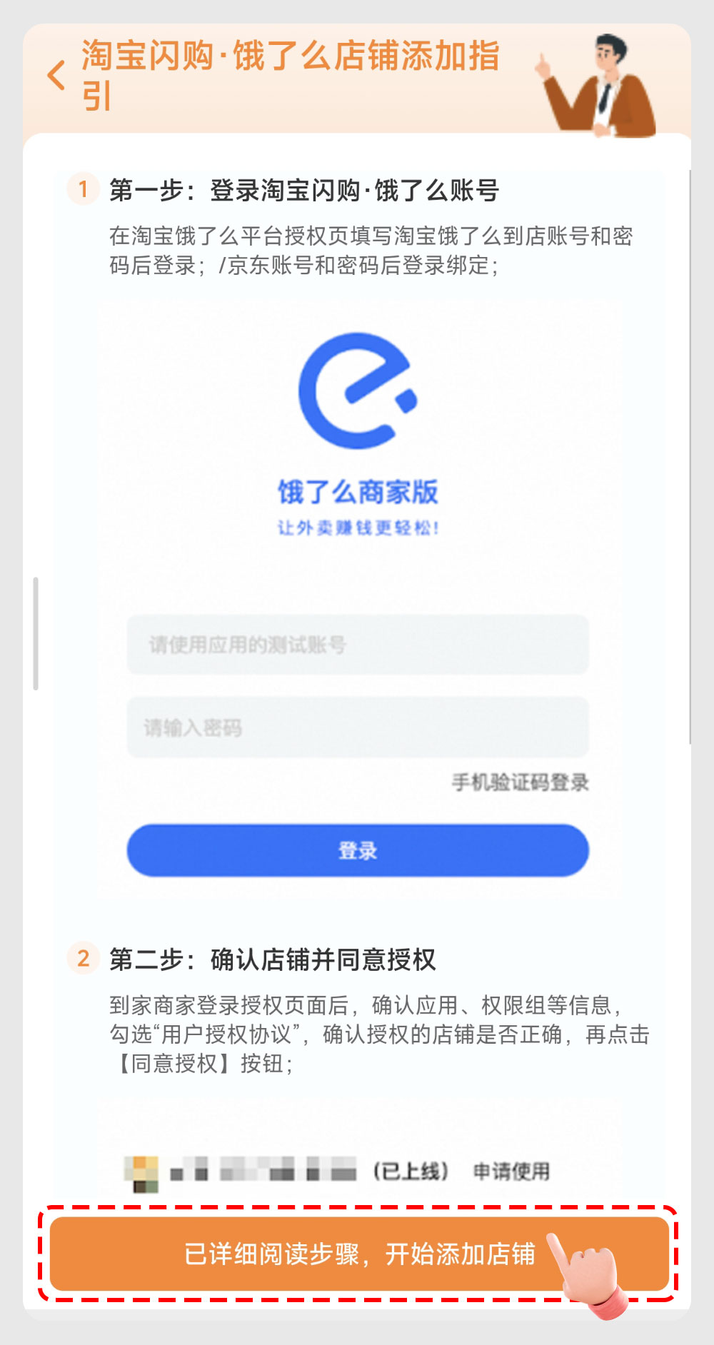 2、点击下方“已详细阅读步骤,开始添加店铺”;