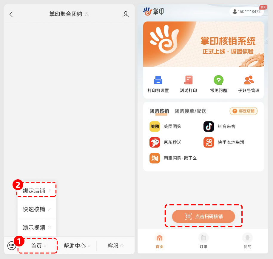 1、公众号首页点击【首页】---【快速核销】或点击掌印核销系统首页的【点击扫码核销】;