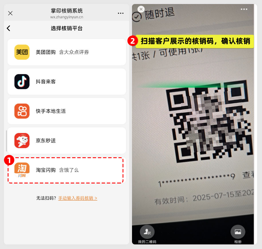 2、再点击淘宝闪购(含饿了么),扫描客户展示的核销二维码;
