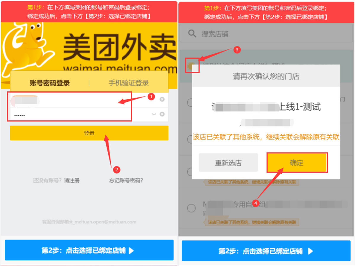 在页面填写先前注册的【美团店铺的账号、密码】(或者使用店铺授权的手机号获取验证码),点击【登录】,勾选需要绑定的店铺,点【确定】;