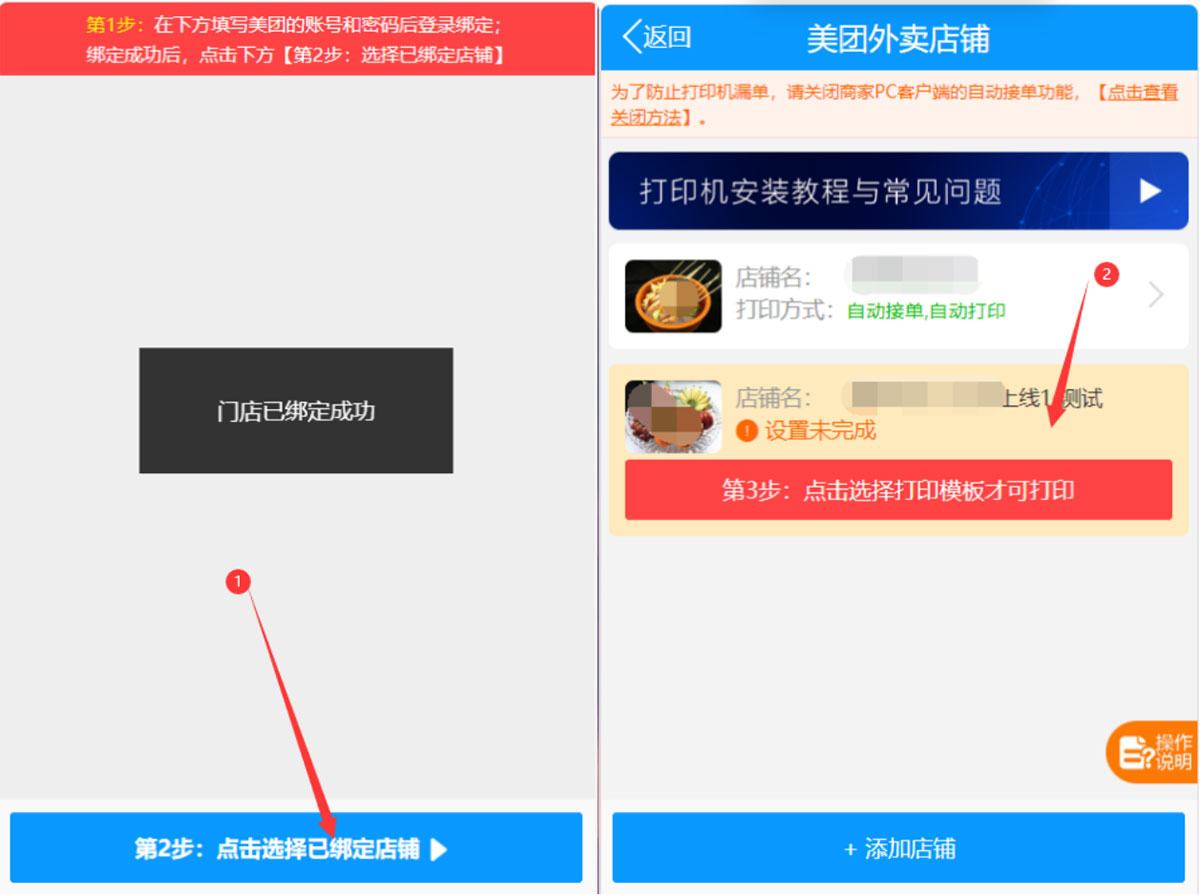 授权成功后,点击下方第2步【已绑定店铺】,找到刚刚授权的店铺,点开【点击选择打印模板才可打印】按钮;
