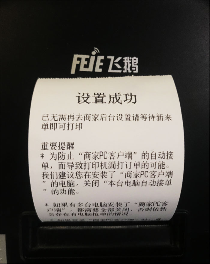 随后,打印机打印出【设置成功】的小票;即表示【店铺已绑定成功】,店铺来新的订单时,打印机即可自动接单、自动打印。