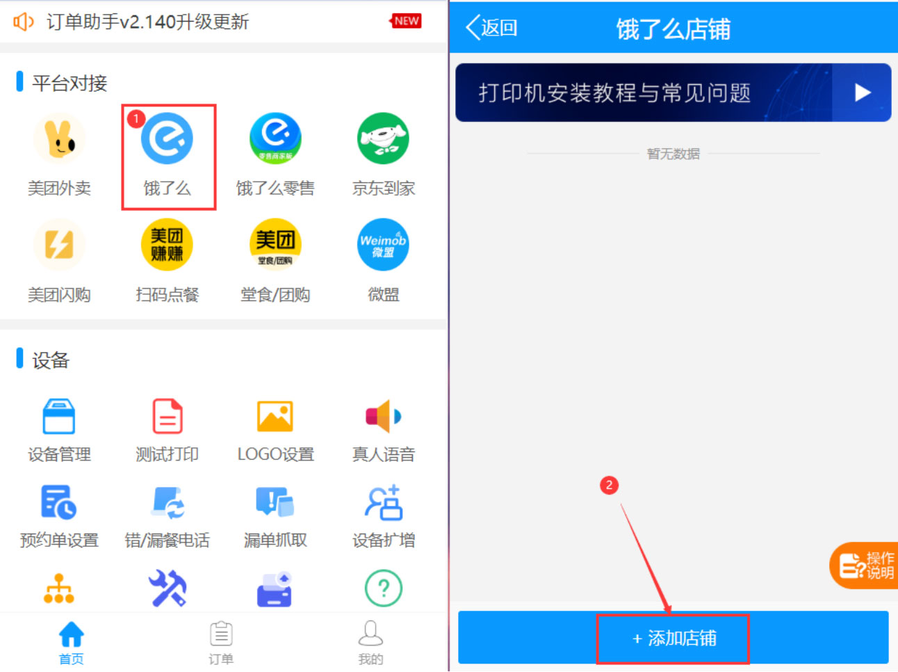 在公众号首页点击【绑定店铺-绑定店铺】,注册并登录【飞鹅订单助手】;