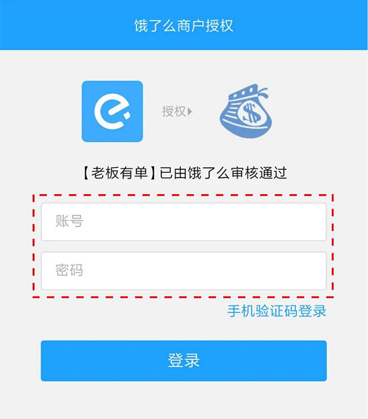 在页面填写饿了么的账号、密码(或者使用店铺账号授权的手机号获取验证),点击【登录】,再点【同意授权】;