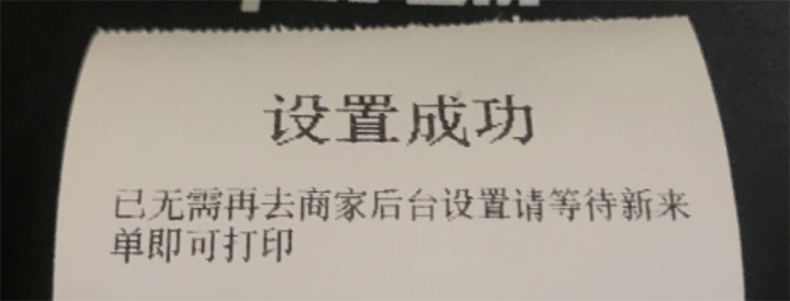 随后,打印机打印出【设置成功】的小票,表示【店铺已绑定成功】,店铺来新的订单时,打印机即可自动接单、自动打印。