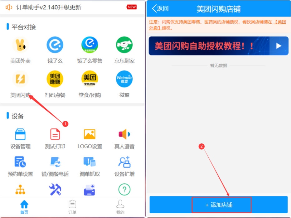 登录后,在【飞鹅订单助手-首页】,点开【美团闪购】图标,进入页面点击【添加店铺】;