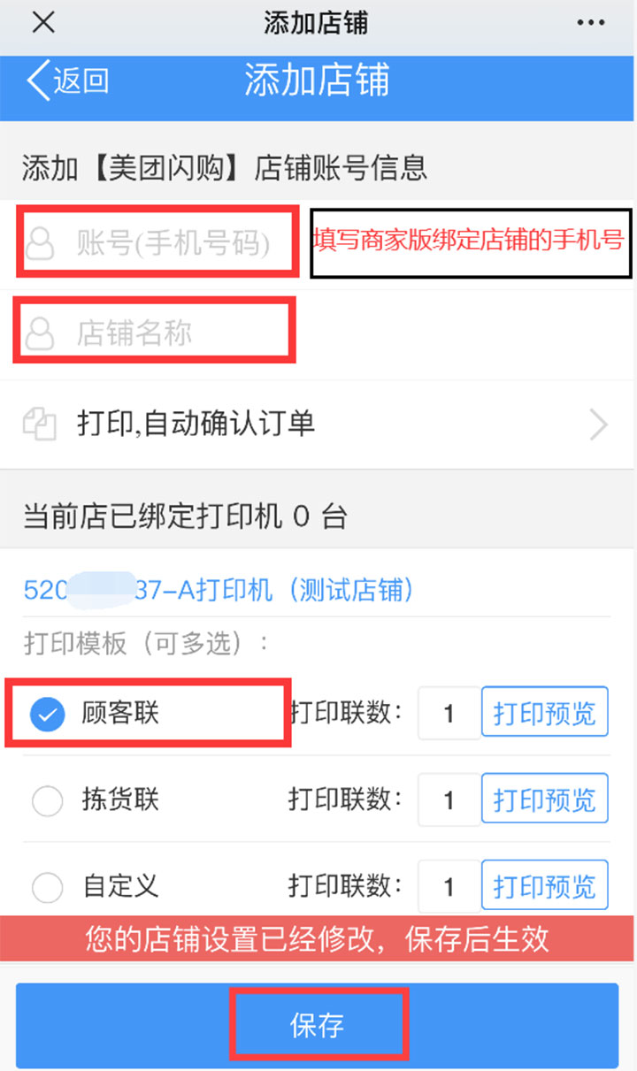 在页面填写您在开店时绑定美团闪购店铺的手机号(账号)、店铺名称、选择打印模板(一般选择客户联),再点保存;