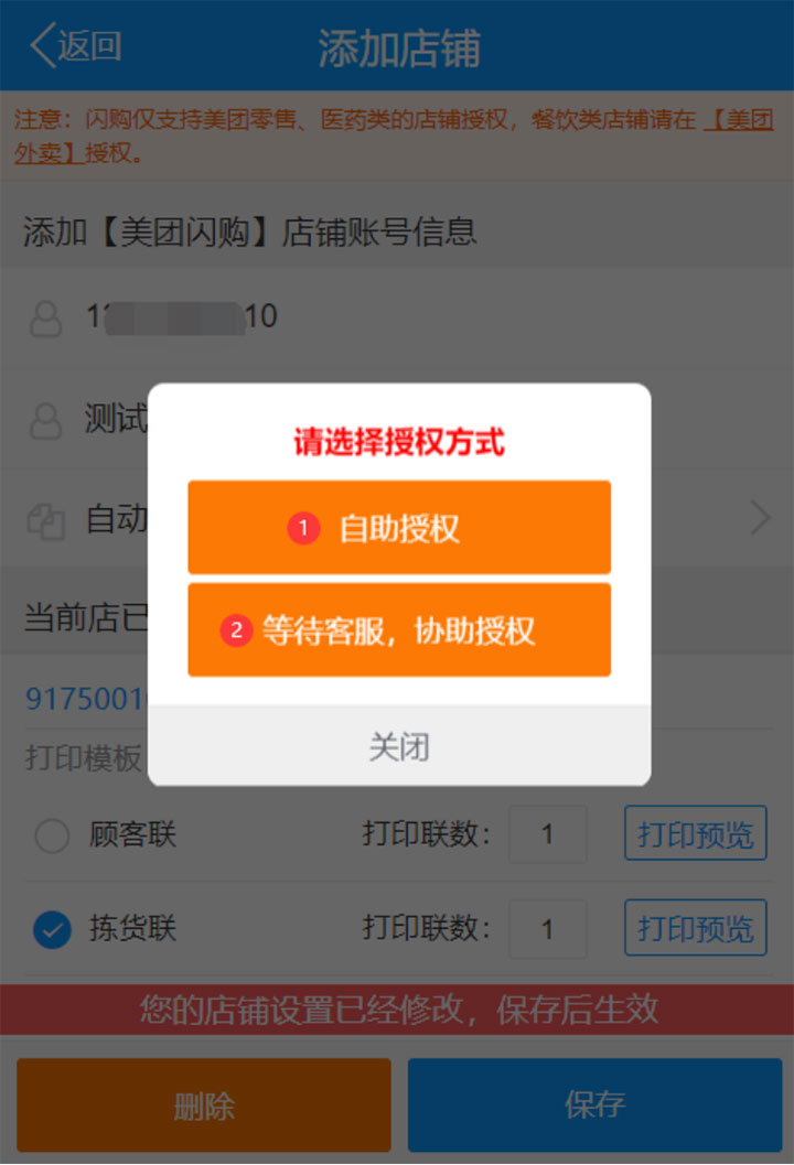 ②,等待客服协助授权的,直接点下面的关闭,等待客服技术联系您协助授权店铺,授权成功的才可以接单打印